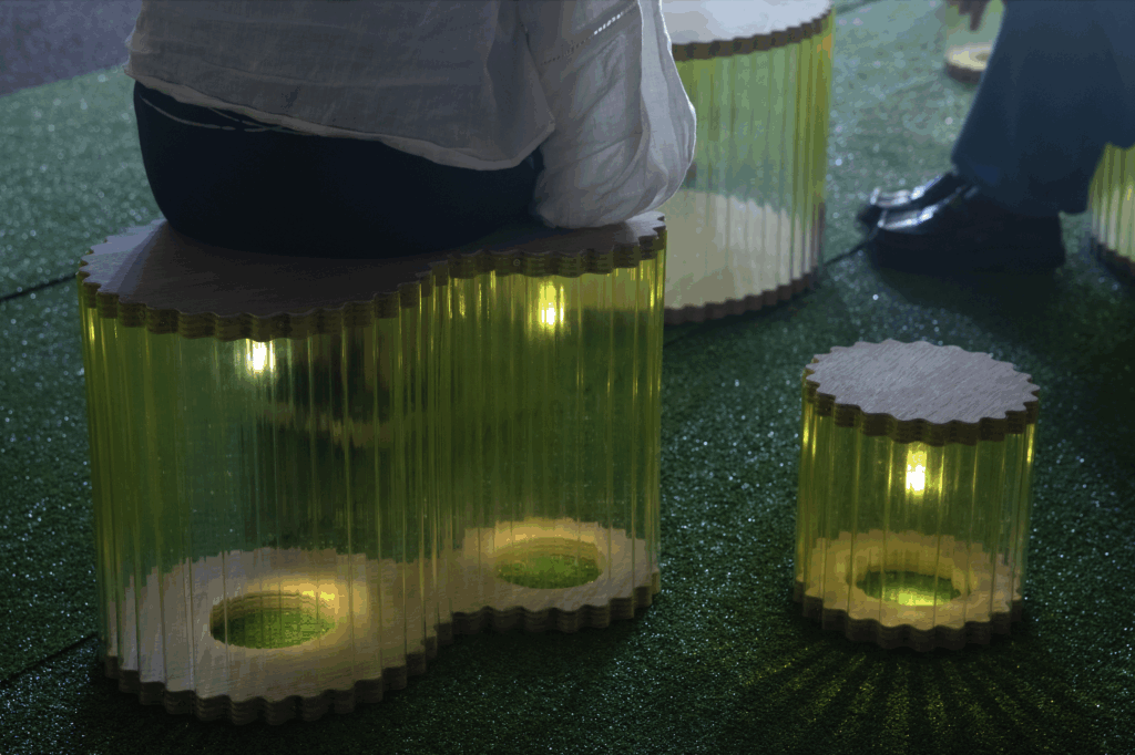 構造体には波板を円筒形に用い、ゼリーのような透明感をまとわせつつ、スツールやテーブルとして必要な強度を確保。座面にはラワン合板を使用し、デジタルファブリケーションによって波形にカットしている。平面形状や高さにバリエーションをもたせ、群として組み合わせることで、人々の拠り所となる多様な居場所を街路に生み出す。波板と合板のみで構成されているため軽量で、子どもたちが自由に動かして遊ぶ姿も見られた。