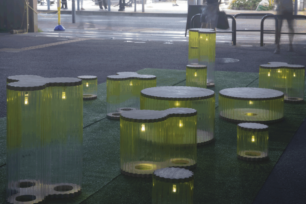 昼と夜で異なる表情を見せながら、三軒茶屋のまち並みにそっと寄り添う。日常の風景に、ほんの少しの彩りを添えるようなストリートファニチャーである。